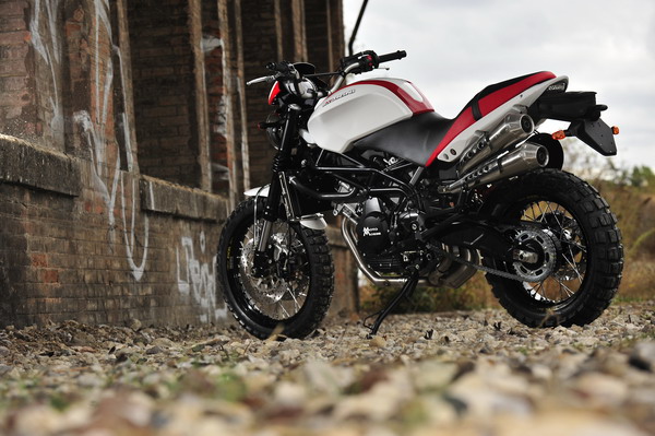 Никаких упрощений и переигрывания канонов стиля. Даже в мелочах Scrambler 1200 наполнен духом того времени, когда не было ничего круче, чем спортивный легкий эндуро с залихвацки уложенными на один борт трубами выпуска. Классический V-твин и ферма рамы, как оказалось, идеальным образом соответствуют стилистике этих машин. 1200 Scrambler оснащен дефорсированным двигателем 1187 см3 (117 л.с.) Подвеска модели идентична модели 9 ½ (вилка от Marzocchi, моноамортизатор Sach). 19-дюймовые спицованые колеса от Excel обуты во внедорожные покрышки. Выпускная система полностью оригинальная и, по сути, является настоящим украшением байка.