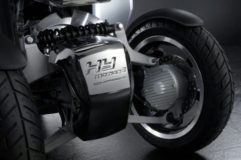 Peugeot и Citroen, являясь прототипом новой полноприводной системы, которая в ближайшем будущем появится и в серийных моделях. В данном концепте HYmotion адаптировали к трехколесной ходовой части: заднее колесо приводит в действие «заряженный»20-сильный бензиновый двигатель, а на передней оси стоят два электромотора, развивающий по 5 л.с. каждый. Общая мощность модели составляет 29 л.с., а средний расход топлива – 2,0 л/100 км.На скутере установлена система ABS для всех трех тормозных дисков всех колес.