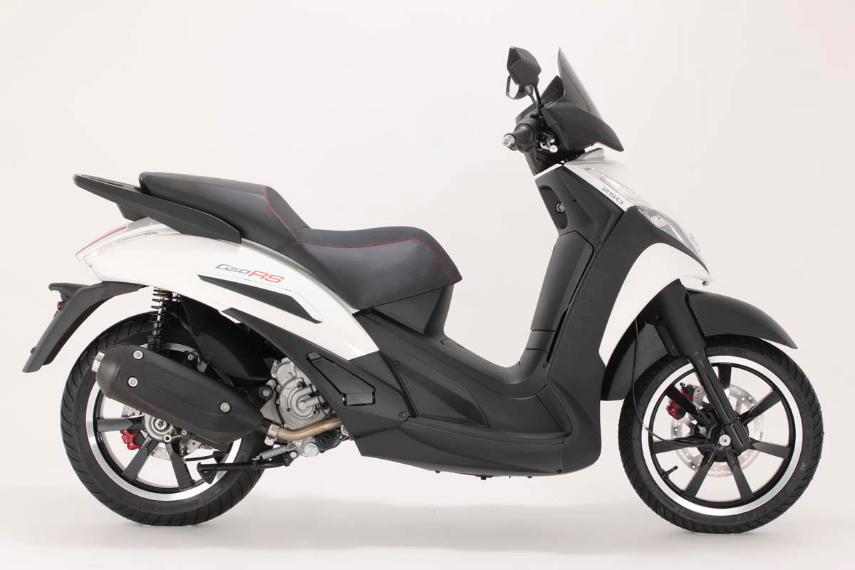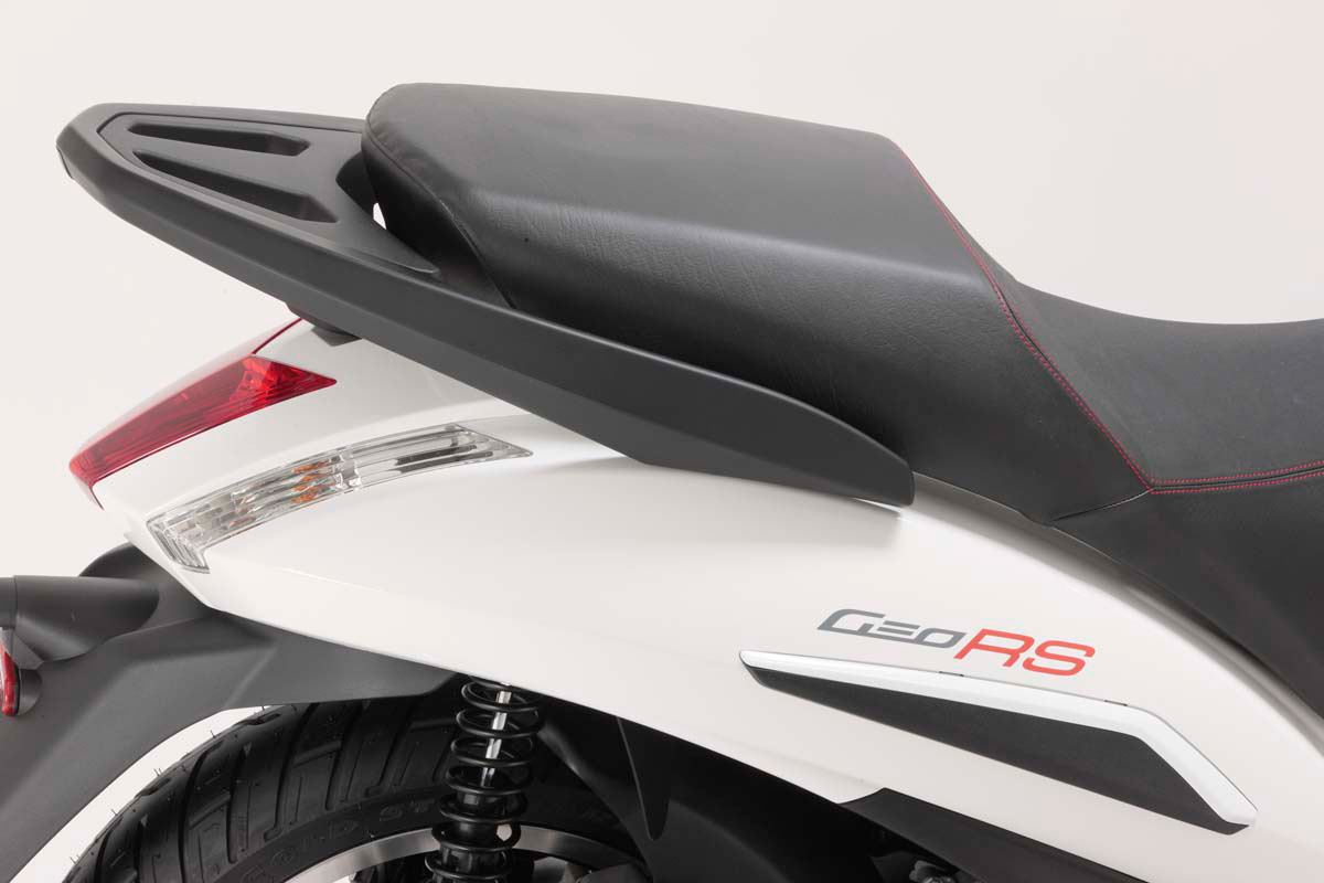 Спортивный стиль и элегантные линии дополняет весьма оригинальная расцветка - часть пластиковых деталей выполнена в серых тонах, а часть - в белых. Среди особенностей - большие шестнадцатидюймовые колеса, удобное сиденье, декоративый багажник и оригинальные подножки пассажира, завуалированные пластиковыми заглушками. Конечно, на багажнике модели GeoRs 250 врядли что-то увезешь, но его плюсы в другом - он служит удобной площадкой на случай, если владелец скутера решит установить кофр.