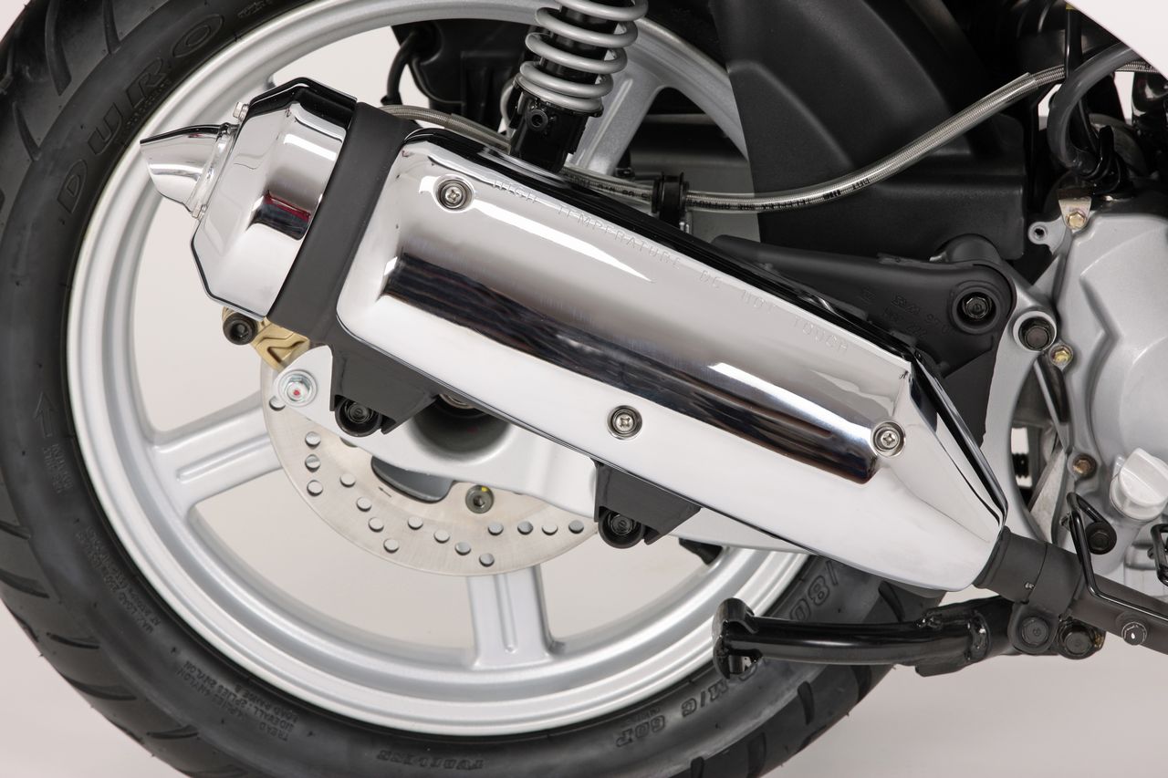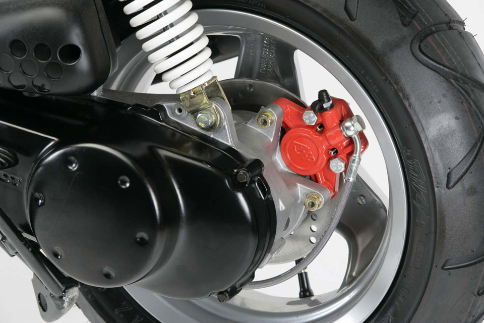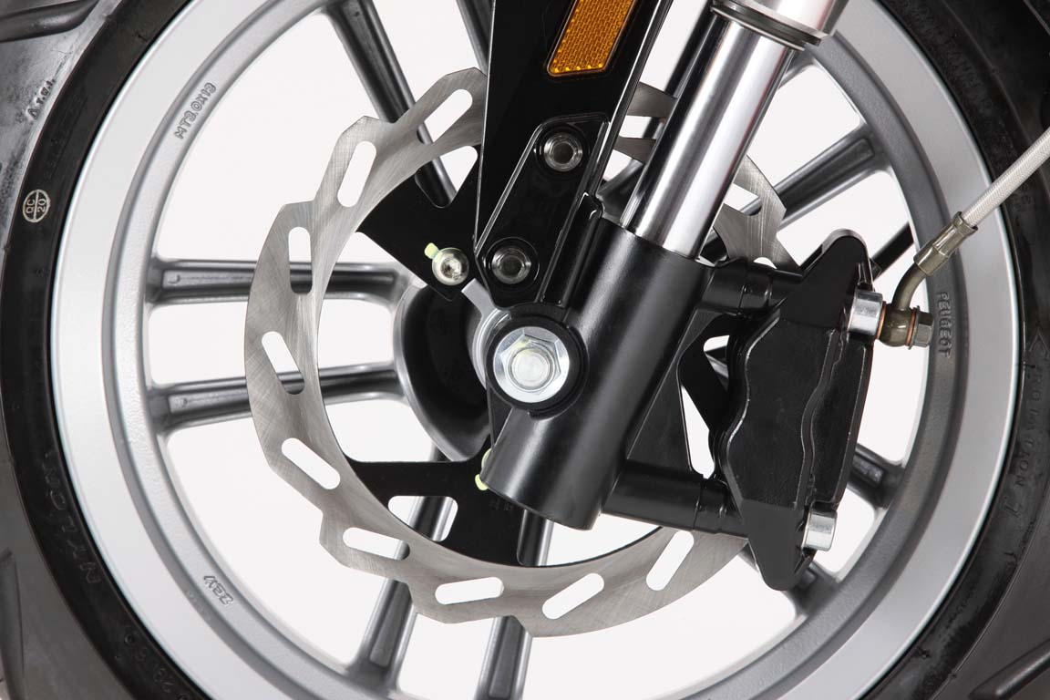 Тормоза - спереди 170мм дисковый, сзади 110мм барабанный. Колеса 12 радиуса. Шины - 110/70-12. Высота сиденья - 780мм. Вес - 85 кг.