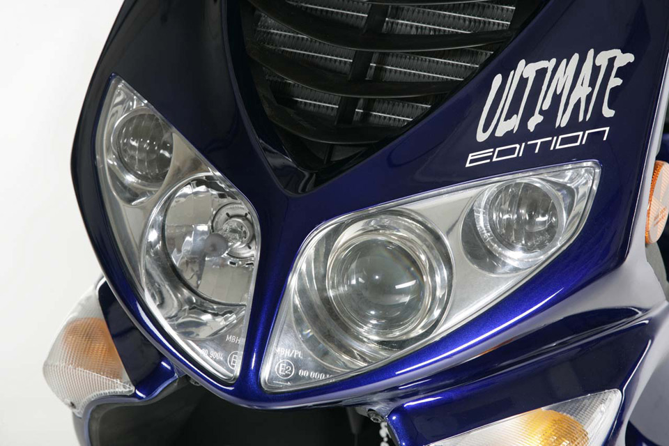 Обновленная модель получила свежую - синюю цветовую схему, обогащенную специфической графикой Ultimate Edition, алюминиевые вставки, новые зеркала заднего обзора, подчеркивающие гоночный норов модели, о котором также повествует и покрытый лаком задний спойлер, и красные тормозные суппорта.