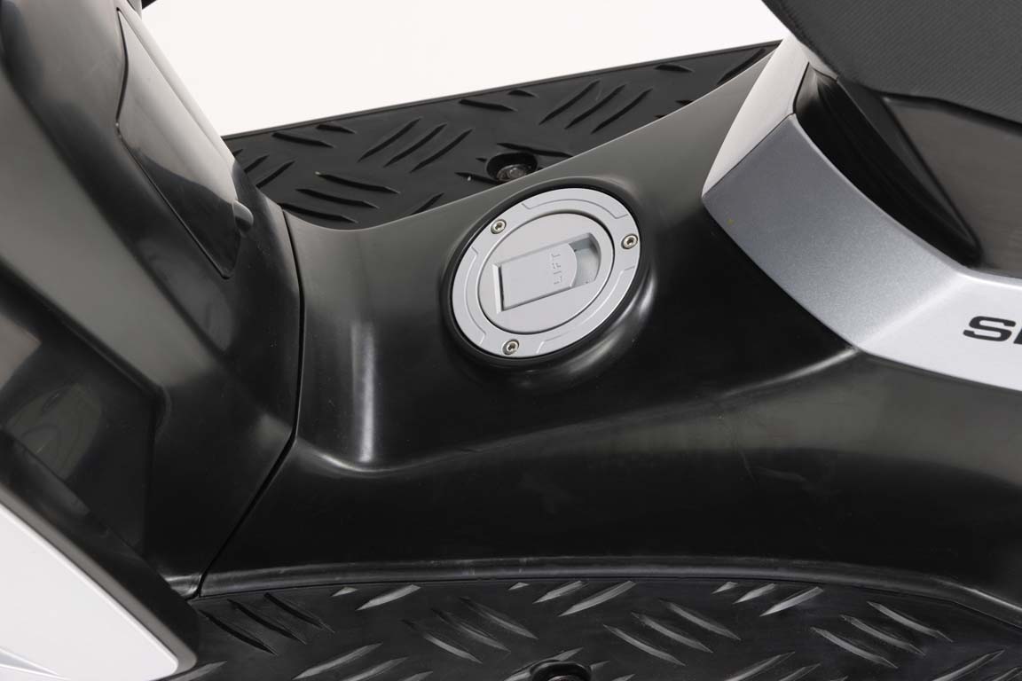 Вес машинки – всего 135 кг. Высота сиденья – 790мм. Тормоза дисковые диаметром 220мм. В багажник под сиденьем влезает шлем. Объем топливного бака – 8 литров.