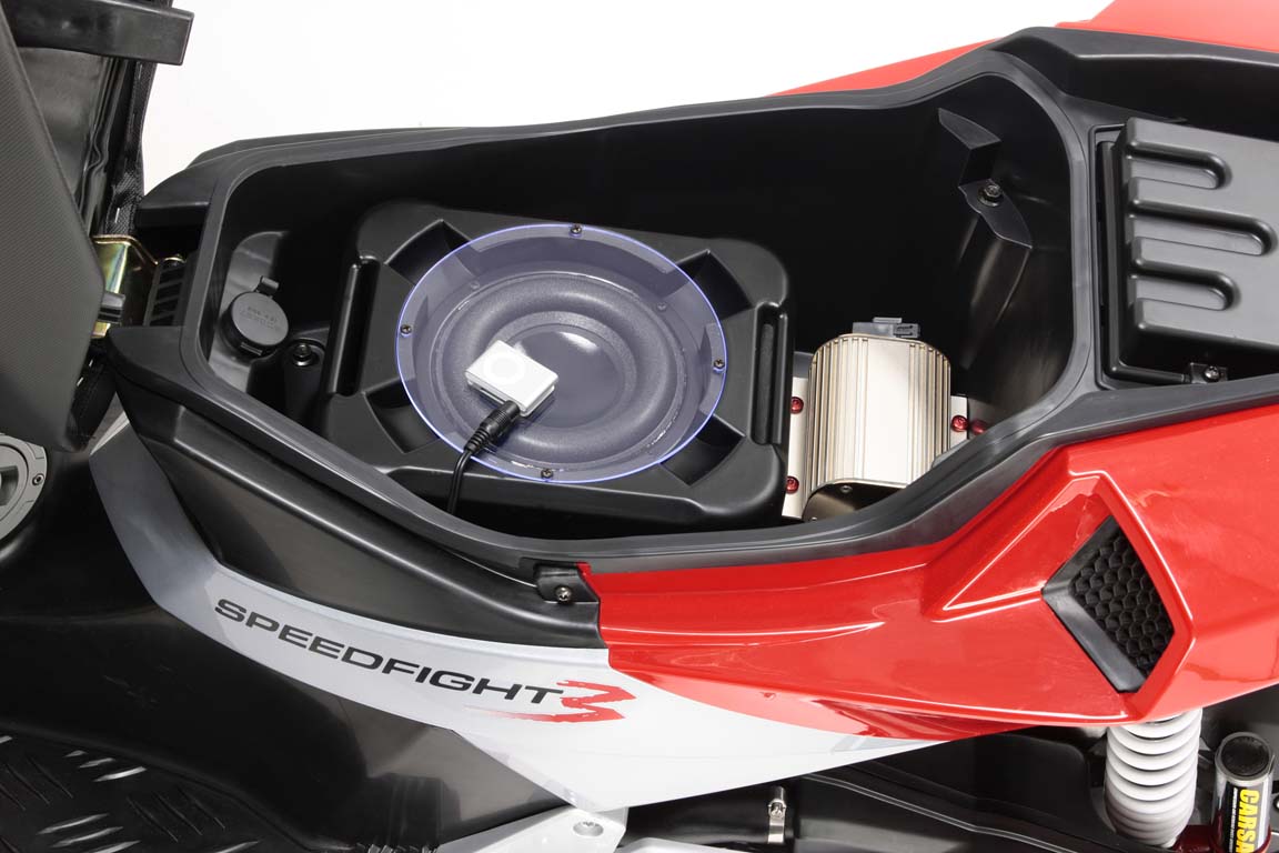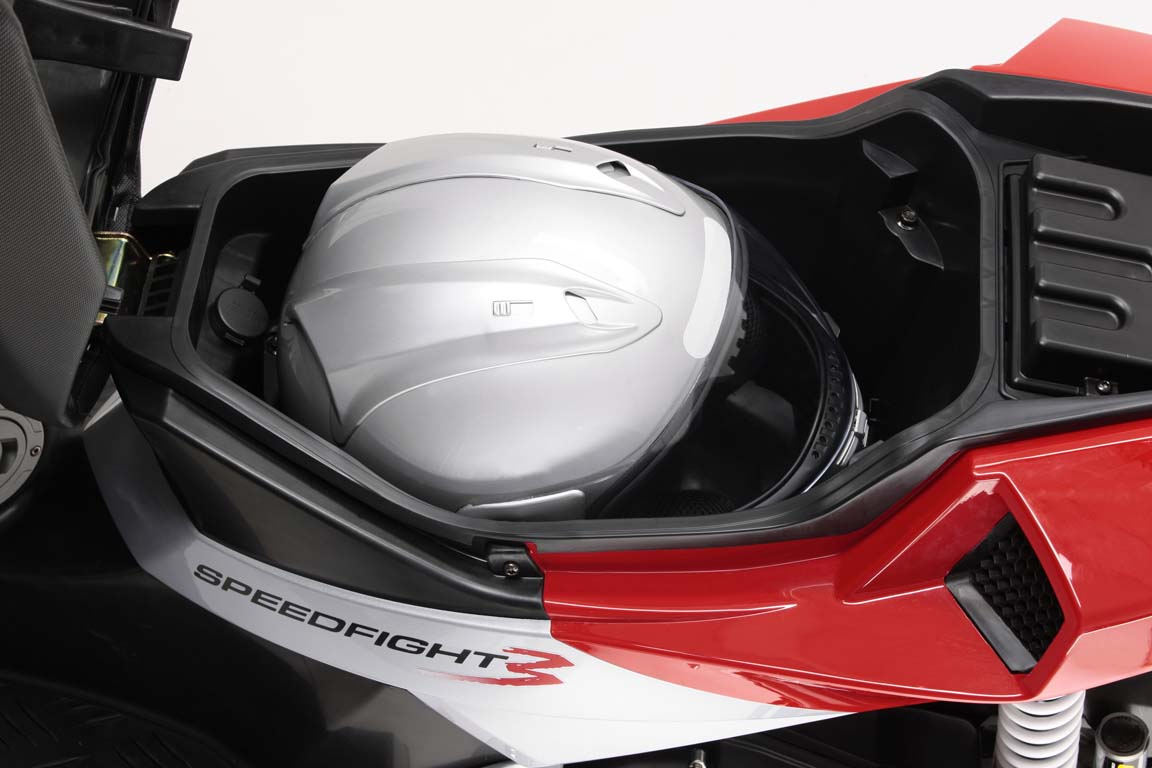 Speedfight 3 комплектуется дисковыми тормозами диаметром 215мм. Новая панель приборов с цифровыми и аналоговыми указателями включает спидометр, часы, указатель температуры и индикатор охлаждающей жидкости. В наличии и розетка 12В, и большой багажник под сиденьем.