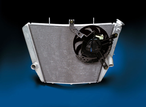 Крупный радиатор трапециевидной формы, разработанный для мотоциклов заводской команды Suzuki, и масляный кулер значительно улучшают охлаждение мотора