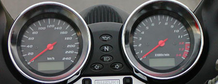 степенью освещенности. Другим преимуществом новой системы подсветки является то, что светодиоды не перегорают так быстро, как простые лампы. Фактически, срок службы светодиода должен быть таким же, как срок службы мотоцикла, если не больше. Спидометр также включает в себя жидкокристаллический дисплей с одометрами, трипметрами (счетчиками пробега) и часами. Шасси