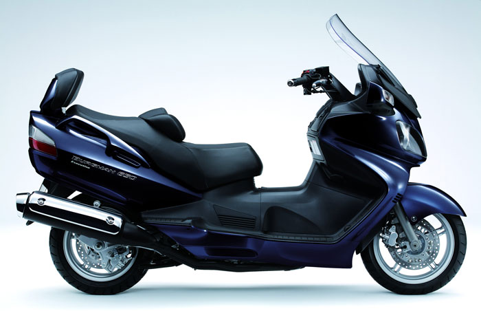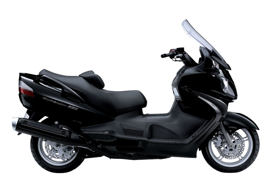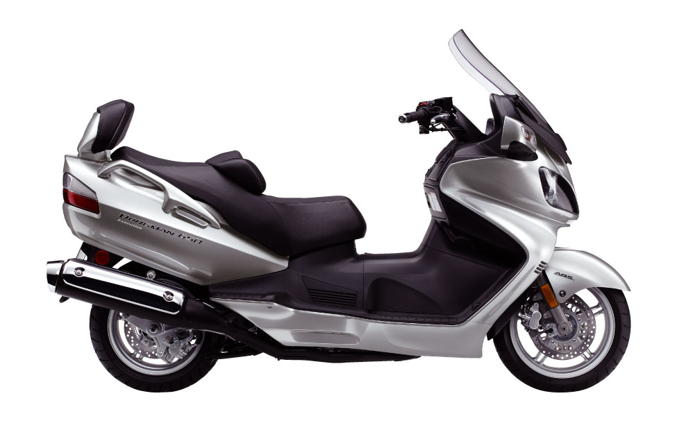 Мегаскутер Suzuki Burgman AN 650 (в Японии - Suzuki Sky Wave 650) дебютировал осенью 2001 года. Рядный двухцилиндровый двигатель, сильно наклоненный вперед, для лучшей развесовки размещен в тоннеле между ногами водителя. Мотор сблокирован с автоматическим клиноременным вариатором с электронным управлением, крутящий момент на заднее колесо передает дополнительная передача. Осенью 2003 года была представлена модификация Burgman AN 650 Executive. В ее оснащение входят тормозная система с АБС, спинка пассажирского сиденья, электрические механизмы регулировки зеркал, хромированные детали отделки.
