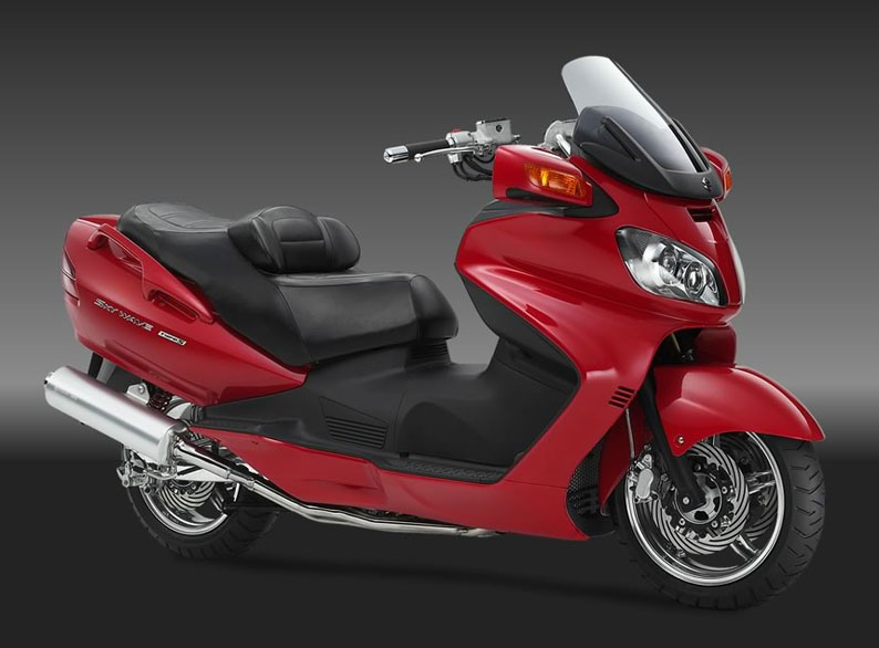 Suzuki Sky Wave 650 Type-SОчень уже стали очень популярными мотоциклы Type S Sky Wave 250 и Sky Wave 400. Версия Sky Wave 650 Type-S – большой скутер, оборудованный электронно-управляемой бесступенчатой регулируемой трансмиссией (CVT). Его конструкция дополнена трубчатым рулем и коротким ветровым стеклом, что функциональными и качественными усовершенствованиями ещё более упрочает высокий статус базовой модели.