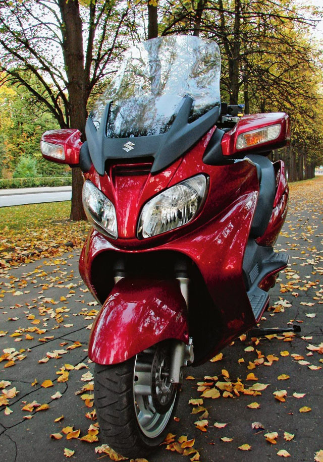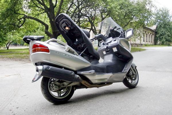 Suzuki AN650 Burgman – один из наиболее распространенных в россии аппаратов старшего класса. Компания Suzuki создала свой 650-кубовый макси-скутер на волне успеха более ранних моделей с двигателями 250 и 400 см3 в 2002 году. Выпуск начался одновременно в США под именем Burgman и в Японии, где модель нарекли Skywave. На просторах России тех и других примерно поровну. различий между ними практически нет, да и те, что есть – незначительные: например «скай» оборудован желтыми рассеивателями поворотников, а «бург» щеголяет белыми. В 2004 году в дополнение к базовой версии скутера появляется «люксовый» вариант. На Burgman Executive/Skywave LX устанавливают ABS, механизм складывания зеркал с электроприводом, спинку для пассажира и хромированную накладку на глушитель вместо черной. В 2005-м топовая версия обзавелась регулировкой ветрового стекла с электроприводом и датчиком температуры «забортного» воздуха, а в 2009 году обогрев ручек руля и сиденья водителя и пассажира перекочевал из списка опций в стандартное оборудование.