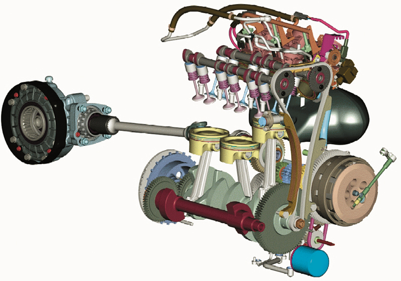 DOHC, четыре клапана на цилиндр. 120-градусный коленчатый вал вращается в