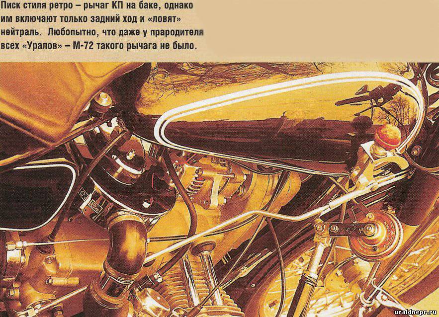 Особенный шик - в деревянном набалдашнике справа от бензобака. Именно таким рычагом в первой половине 20 века на всех мотоциклах переключались скорости. Но испуг многих, с первого взгляда не приметивших под «горшком» двуплечевого рычага ножного переключения передач, оказался необоснованным: ручным рычагом включается только задний ход и облегчается поиск нейтрали.