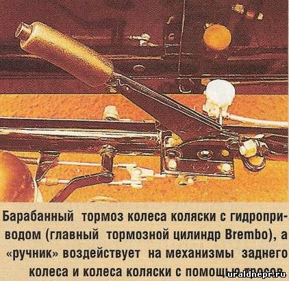Передний тормоз - дисковый - также с гидроприводом. Кстати, первые образцы «Ретро» комплектовались передним барабанным гидравлическим, что позволяло сохранить одно из достоинств мотоцикла с коляской: взаимозаменяемость всех трех колес. К сожалению, американские и европейские требования не позволяют устанавливать барабанный тормоз на переднее колесо мотоцикла, поэтому на современных экспортных моделях установлен дисковый. Устанавливается также и «ручник» автомобильного типа.