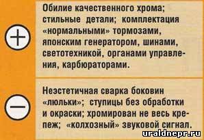 А еще заводчане рассказали, что всего выпущен 41 «Ретро»: 14 одиночек и 27 с коляской (любопытно, что пять аппаратов купили в «праворульной» Японии). На 2004 год планом предусмотрен выпуск 90 машин с коляской. Производство работает «под заказ», срок исполнения - 2 месяца. Если будут заказы, возможны продажи и на российском рынке. Правда, в нашей стране есть сертификат лишь на модель с коляской, и то на ограниченную партию. Трудно прогнозировать, будут ли соотечественники записываться в очередь в дилерских мотосалонах - пока у нас предпочитают приобрести разбитый «совнархоз» и довести его до кондиции. Так считают на ИМЗ. Мы в редакции уверены, что после сообщения о возможности купить мотоцикл Урал-Ретро в России, очередь образуется не меньше, чем в Америке, тем более, что цена этих мотоциклов здесь значительно ниже - около $6000 с коляской и 4500 - «соло».
