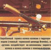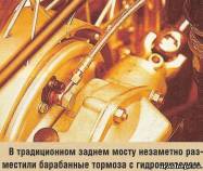 «Обращение к корням» видно по тормозной системе. Проще, казалось бы, установить современные дисковые тормоза. Конструкторы пошли другим путем: в стандартную барабанную ступицу упрятали (и не догадаешься!) тормоза с гидроприводом. И волки сыты, и овцы целы: приличное торможение достигнуто, а тормоза стилизованы «под те времена».