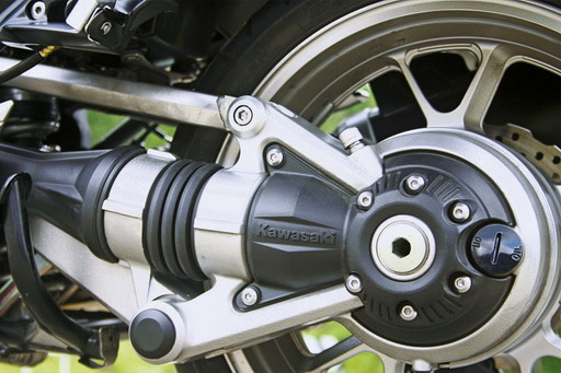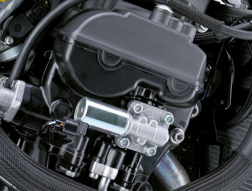 Основой модели GTR1400 является «максиспорт» ZZR1400, от которого взяты двигатель и ходовая часть, измененные и адаптированные к новому, туристическому назначению. 4х-цилиндровый мотор установлен в цельноотлитой алюминиевой раме, которая в верхней части содержит и резонатор впуска. Дроссельные заслонки имеют диаметр 40 мм (у ZZR1400 – 44 мм) для улучшения скорости ответа на низких и средних оборотах. По той же причине была изменена форма поршней, а масса маховика – увеличена. Самая интересная новинка – это ГРМ, оснащенный системой регулировки фаз впускных клапанов VVT (Variable Valve Time) – переменное время открытия клапана). Благодаря гидравлическому блоку, расположенному на его конце, (которым управляет подстанция, контролирующая положение дроссельных заслонок и количество оборотов коленвала), распредвал может менять свое положение в пределах 24°, изменяя момент открытия впускных клапанов и оптимизируя сжигание топливной смеси. Эта автомобильная технология была адаптирована для мотоциклетного мотора, как нам подтвердил Нишигучи Нобуюки (Nishiguchi Nobuyuki), конструктор этого двигателя: «Было нелегко реализовать такое решение из-за большой удельной мощности и, прежде всего, из-за высокой «планки» максимальных оборотов, которые этот мотор может развивать». VVT может найти и другое применение, может, в более спортивных двигателях. Еще одним преимуществом Кавасаки является механизм проскальзывающего сцепления (эта же система снижает нагрузку на рычаг). Кроме того, здесь есть шестая передача типа «овердрайв» (то есть, с передаточным числом меньше 1), что, безусловно, экономит топливо на магистралях.