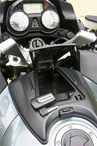 С левой стороны обшивки FJR предусмотрен небольшой бардачок, в который можно положить талон для оплаты проезда по автомагистрали или использовать его для подзарядки мобильного (внутри – розетка на 12 В). У Kawasaki тоже есть электророзетка и бардачок, расположенный над баком в удобном положении (хоть и открывается он не так легко), но он перекрывается сумкой. Как GTR, так и FJR оснащены крепкими багажниками: у Kawasaki он шире и более «стильный», чем у Yamaha, но может поцарапаться крючками багажной сетки. Под седлом у обоих мотоциклов есть место для сумки с инструментами и аптечки.