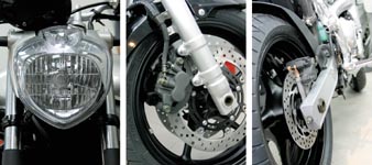Мотоцикл очень красив. Впервые увидев его на улице, в памяти остается образ цельной биологической субстанции, создать которую могла только природа или космос. Большой бак-панцирь накрывает скелет ажурной алюминиевой рамы. Последняя создана при помощи технологии гидроформинга и состоит из двух половин, скрепляемых болтами. Очень короткий блок двигателя сидит в раме плотно, без каких-либо видимых просветов. Рулевая колонка с безумно красивой фарой и несколько смещенным в сторону электронным спидометром, составными хромированными зеркалами и маленькими дольками-указателями являет добродушное лицо космического пришельца (или большеголового насекомого). В тему решена и задняя часть байка — сплетенная из стали и лихо закрученного пластика, двухуровневое сиденье с удобными (как оказалось впоследствии) ручками “второго номера”, венчаемая агрессивным раструбом двух выхлопных труб. Звездолет!