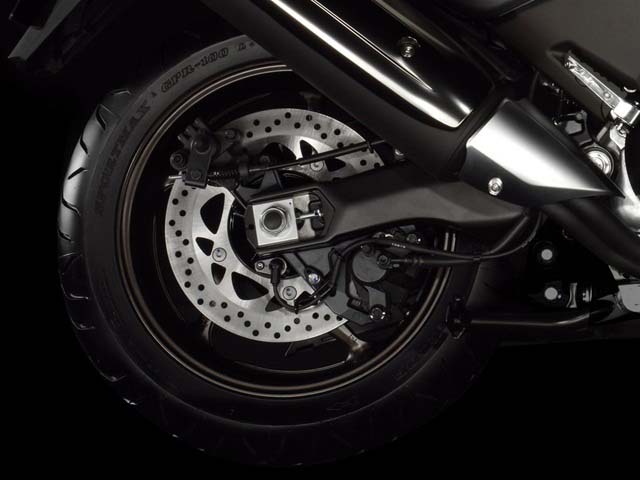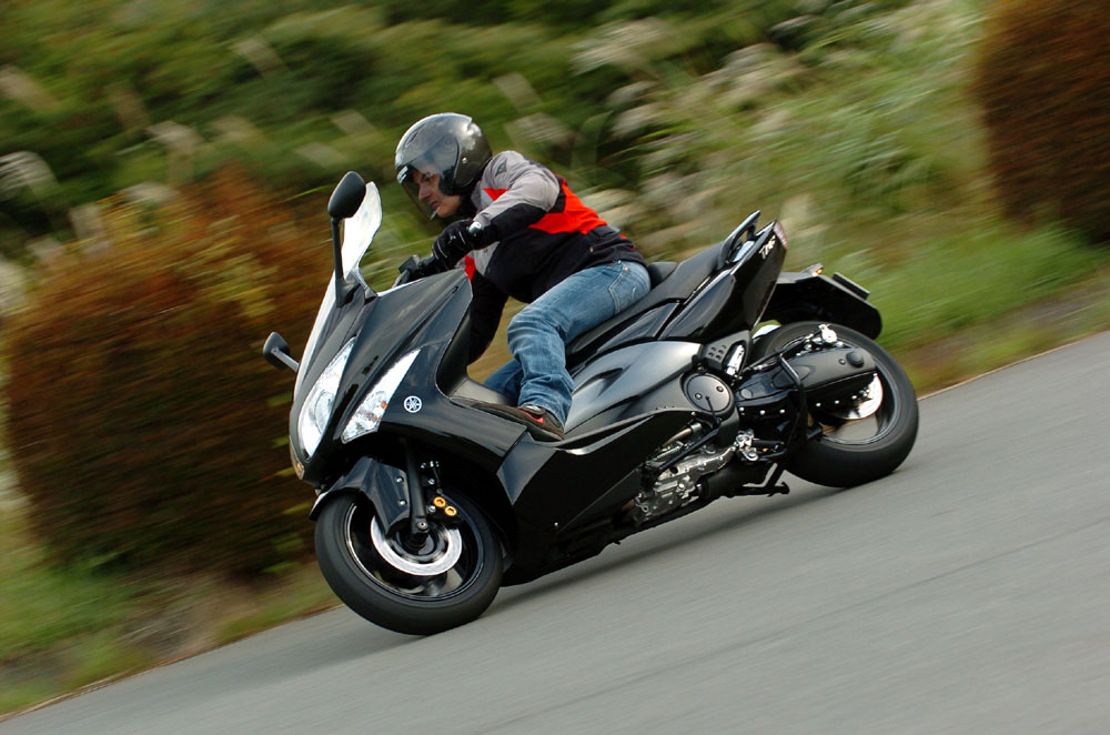 Внешне - увеличенный на треть "нормальный" скутер. Конструктивно и на ходу - ещё более "нормальный" мотоцикл. Только с вариатором и с весьма скромным относительно габаритов мотором. Всё вместе - более чем удобное и практичное транспортное средство. При этом "равноудалённое" и от мотоциклов, и от скутеров, и от автомобилей. РЕ-КОНСТРУКЦИЯ Только лишь слухами о появлении этого гибрида мотоцикла и скутера был произведён форменный переполох. А спустя год, осенью 2000 года, в Японии и Европе одним культовым аппаратом стало больше - на ход текущих событий не повлияло даже почти одновременное появление 600-кубового "самоходного дивана" от Honda, а спустя год - и от Suzuki. Аппарат мгновенно выдвинулся в лидеры продаж среди "макси". И в первую очередь благодаря совмещёнию скутерного комфорта и управляемости мотоцикла. Благо, для последнего "патронов не жалели": мотор в раме (главная передача - цепью в герметичном лонжероне маятника, имитирующем корпус вариатора), вилка - "полноразмерная", а колёса по тем временам не совсем скутерного, 14-дюймового, размера. Тем не менее осенью 2003 года аппарат переработали, а ещё спустя год на нём появилась АБС. Именно такой аппарат (а только такой и мог быть: вариант без этой системы к нам не завозится) и попал на тест. "Просветлённая" оптика, изменённое седло, а главное, новая "приборка" модной конфигурации - "два колодца и ЖК-дисплей между ними", впрочем, "колодцы" эти не слишком глубокие. Потенциальный клиент не слишком жалует Alfa 156 - их авто, как правило, носят немецкие марки. Данные меры хотя и не сделали скутер более ярким, но приятно осовременили удачный дизайн работы голландской студии Yamaha - той самой, где за несколько лет до этого был совершён ещё один переворот в мотоиерархии,- первое поколение TDM. Это внешне. Внутри - отличия посерьёзнее: заднее колесо на дюйм больше, передних тормозных дисков целых два, а силовой агрегат и вовсе перелопачен. Заново разработаны вариатор, головка цилиндров, поршни, карбюраторы уступили место впрыску… В общем, Федот, да не тот. Каков именно, это мы и узнаем! Итак, рюкзак в "унитаз" (он остался прежним, так что только отмечу: благодаря прямоугольной форме и "кривому" днищу туда можно положить всякой всячины, затем кинуть дождевик, и ещё останется место для сумки с ноутбуком), документы и сигареты в "бардачок" - поехали. Выползая на трассу, успеваю оценить стильность и информативность новой "приборки" - действительно, безупречно! Но это всё мелочи по сравнению с удобством посадки: по пространству для водителя Tmax - один из лидеров (просторнее только за рулём Malaguti Spydermax!), но, самое главное, треугольник "ручки-седло-подножки" здесь просто идеально выверен. Вот только тем, кто привык гонять на спортбайках, сложновато будет: поджать ноги не даст центральный тоннель, резко расширяющийся сзади из-за широкого мотора. Но мы на скутере или где?