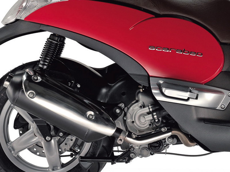 ДвигательЗа своим оригинальным внешним видом Scarabeo скрывает сложные продвинутые технологии. Обе версии снабжены четырёхтактными двигателями жидкостного охлаждения и включают в себя такие продвинутые особенности, как 4 клапана на цилиндр. Эти двигатели сочетают в себе бесшумную работу и контролируемый, плавный разгон.
