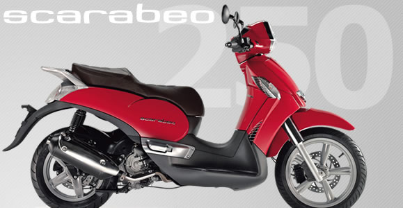 В 250 модели всё новое: двигатель, рама, тормоза и пластик, всё показывает на размер нововведений по сравнению с 200 версией. Scarabeo не просто универсальный и манёвренный городской скутер, но также и практичный турист. Scarabeo безопасен при езде, а его характерный итальянский стиль придаёт ему особое обаяние.