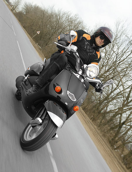 Плюс к тому обнаружилась и недостаточная жёсткость рамы, явно изначально предназначавшейся для «полтинника». Нет, дрезину с мотором скутер не напоминал, в принципе, ходовка вполне адекватна моторчику. Но уже на пределе, так что тюнинговать движок я не советую. Если только по мелочам, и то не столько для «дури», сколько для звука. Всё же «прямоток» и «нулевик» здесь уместны как нигде! Правда, единственный предлагаемый для этого мотора «прямоток» – британский PM Tuning – несусветно дорог. Но аппарат и сам не из дешёвых, к тому же внешний вид этого хромированного конусовидного девайса, да с закрученной в поросячий хвост столь же блестящей приёмной трубой здесь будет в самую масть.Так, держа ручку газа всё время открытой, я и двигался в трафике (надо сказать, достаточно уверенно), пока не свернул на загородную дорожку внутриколхозного значения. А там – весенняя слякоть с присущей ей жидкой грязью, ровнёхонько покрывшей дорожное полотно. После проезда по ней (слава богу, недолго, километра три) скутер уже нуждался в мойке. А вот со мной всё обошлось: развитая задняя облицовка хорошо прикрыла спину от брызг, что на аппаратах такого «калибра» большая редкость.