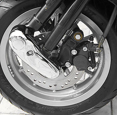 Составная тормозная система автоматически распределяет тормозное усилие между передним и задним колесом. Оба колеса снабжены мощными дисковыми тормозами. Хорошее сцепление шин, позволяет водителю постоянно пользоваться этой системой, сохраняя полный контроль над торможением. Наконец естественный баланс Scarabeo и вертикальная посадка водителя обеспечивают активную безопасность, характерную для мотоцикла.