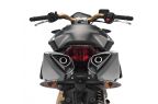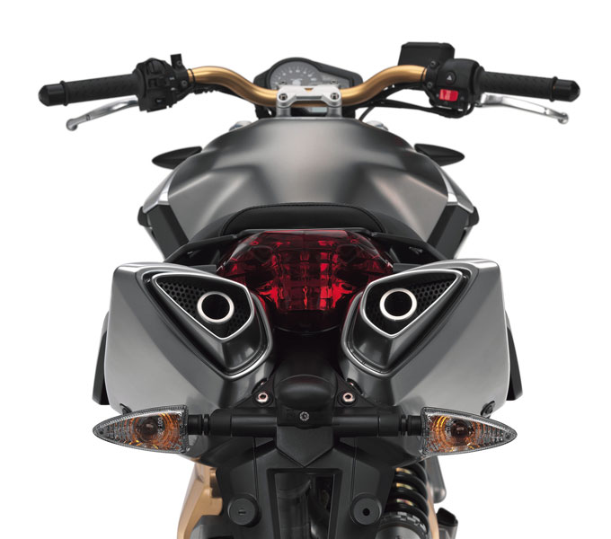Компактные размеры мотоцикла позволяют водителю отлично чувствовать мотоцикл, а сужающийся хвост, который включает концевики выпускной системы треугольной формы - делает проект еще более агрессивным, держа распределение веса очень симметричным.