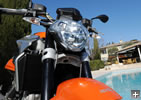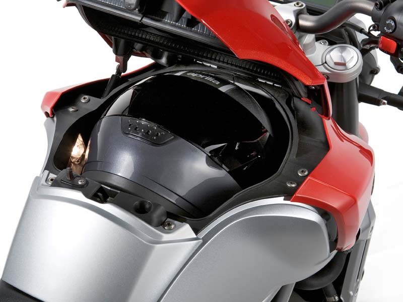 Прямой алюминиевый руль, обеспечивающий максимальную легкость и контроль, был унаследован от флагманской модели Aprilia Tuono. Компоненты самого высокого класса, которыми больше не может похвастаться ни один мотоцикл. Передняя фара в форме двойной параболы имеет сложные поверхности и двойной фонарь стояночного освещения.