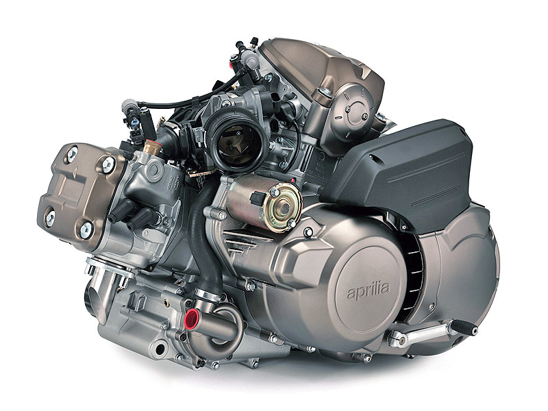 Этими четырьмя клапанами в цилиндре управляет единственный верхний стержень с двигателем цепи, упрощая обслуживание, в то же самое время гарантируя эффективную работу. Как обычно для двигателей высокой производительности Aprilia, смазка при сухом картере, с отдельным резервуаром, объединенным в двигатель, чтобы подавить вес сборки. У этого двигателя есть еще одно преимущество: большой объем вентиляционной и выхлопной труб. Автоматическое управление двигателя включает сложную систему впрыска топлива Вебера-Марелли (топливная система инъекции с 38 мм регулируют систему воспламенения с двумя свечами зажигания на цилиндр, особенности, которые приводят к оптимальному сгоранию на всех скоростях, улучшая работу и уменьшая загрязнение).