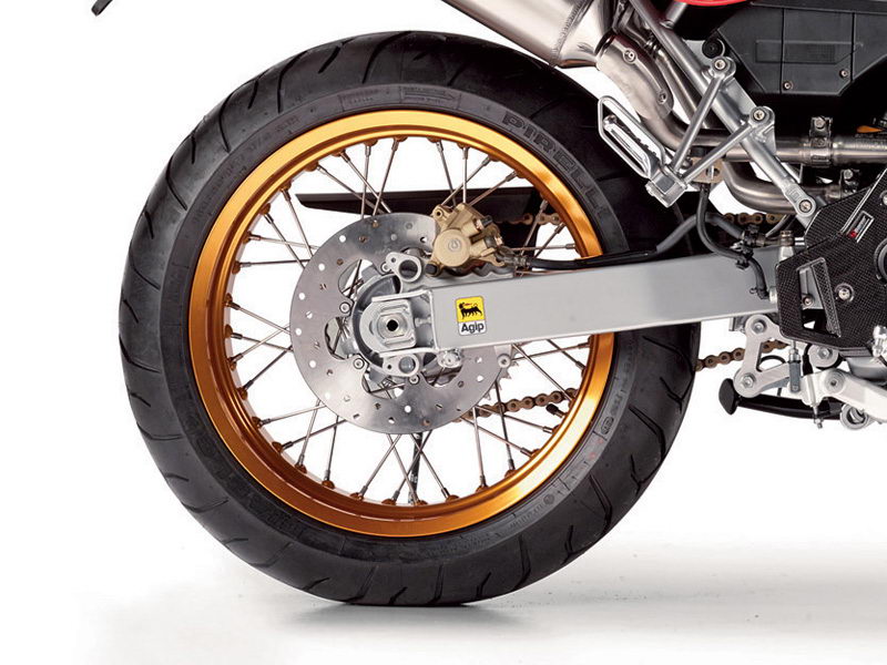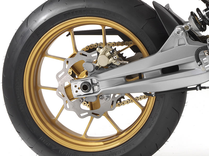 Движок выдает 130 л.с. при 8 700 об./мин. Момент – 115 Нм при 7 200 об./мин. Гибридная рама совмещает как стальные части, так и алюминиевые (например, алюминиевый задний подрамник). Передняя подвеска – 43мм перевернутая вилка Sachs. Тормоза – 4-поршневые с радиальными суппортами Brembo.