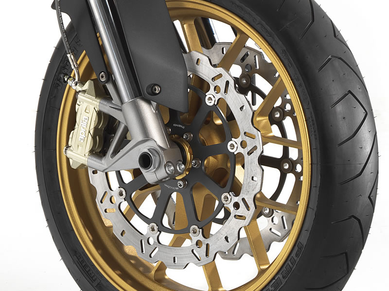 Передний тормоз, состоящий из 2 плавающих дисков из нержавеющей стали Ø 320 мм с 4-х поршневыми суппортами, плюс армированные тормозные шланги – просто искусство на рынке мотардов.